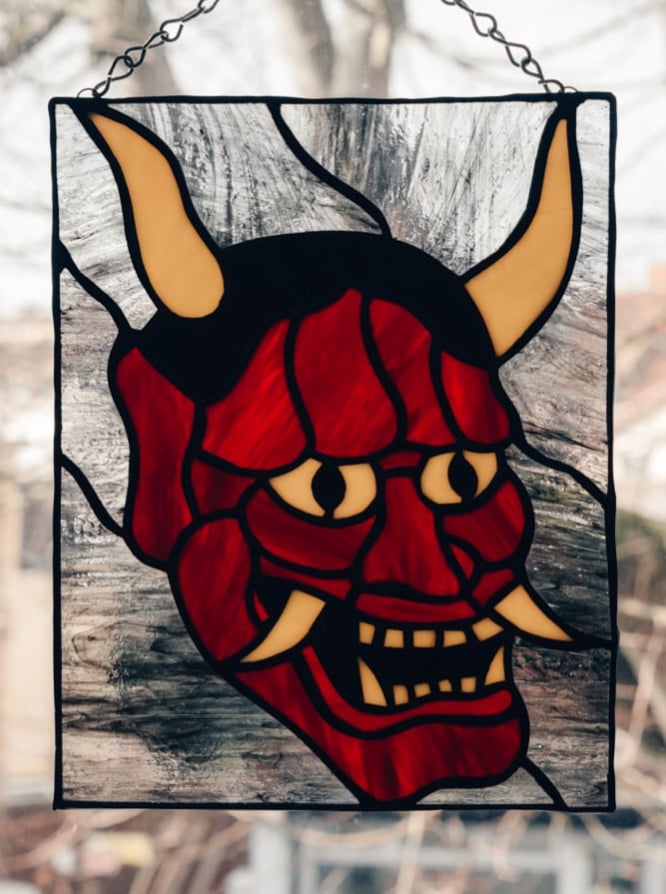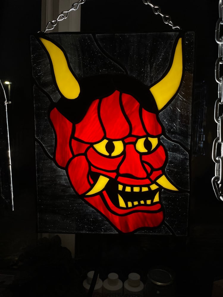 Made using Transparent Ink, Bone, Black and speckled Red Luna glass from Creative Glass Guild, with each piece cut and soldered by hand. Designed to hang decoratively using chains and catch the light.